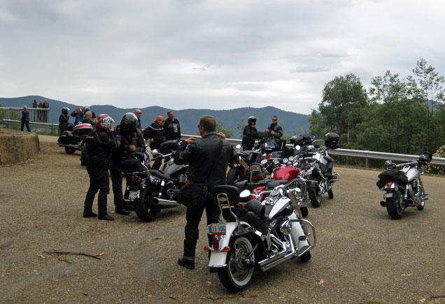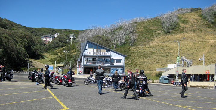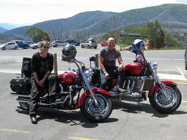 A couple of old bikers in front of the Information Centre / Resort Management Office at Falls Creek looking out to the silver spars of trees burnt in the 2003 fires. As the sign behind says it is 31kms back to Mount Beauty and 77kms to Omeo from this point.