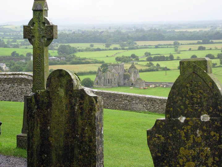 A view through the gravestones at the Rock of Cashel to the fields below and yet another ruin of a church. As you can see the day is to quote our Hotelier “a grand soft day’ which in our terms means soft drizzly rain to rainy drizzle and back again….which it has been all day…or close to it.
